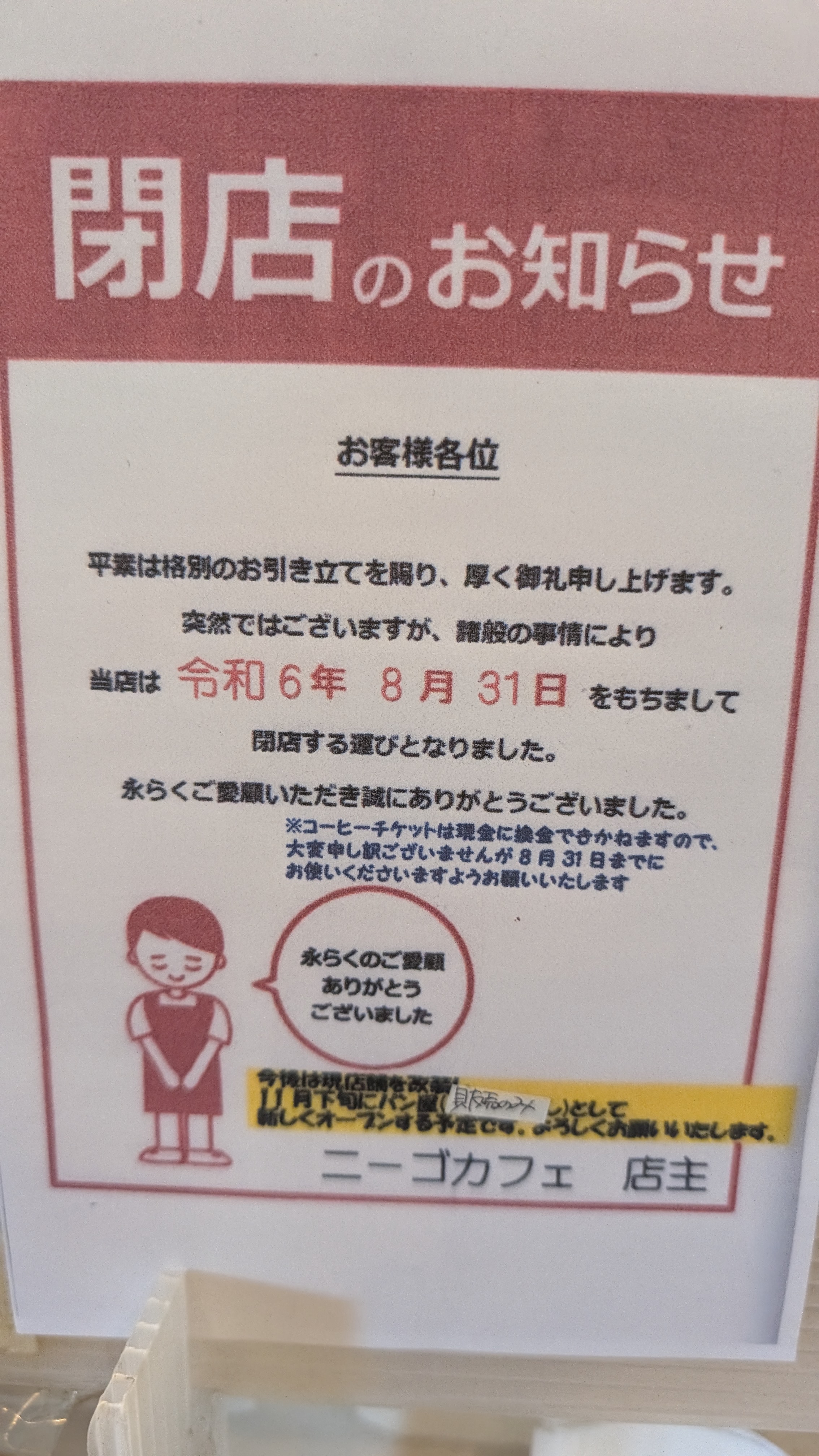 11月下旬にパン屋として再オープンするとのことだったので、近くにはラーメン屋さんもあるし、11月には寒くなるからラーメン屋でラーメン食べてからパンを買いに来ればよいかな、と思っていたら、日曜に行ってみたらそのラーメン屋さんは10/27で閉店のお知らせが。