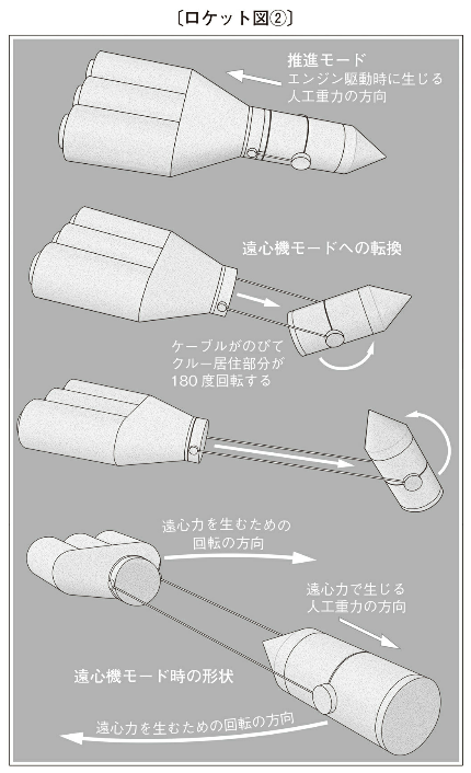 この、太い円筒部分の直径が約4メートルとのことなので、だいぶ狭い。当然こんな巨大な宇宙船は宇宙で組み立てるわけですが、一度に打ち上げられる大きさが直径4mくらいだったのではないか、という推測が書いてある。先週名古屋市科学館で見てきたH2ロケットのペイロードのフェアリングがそれぐらいの大きさですしね。