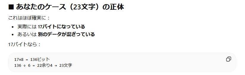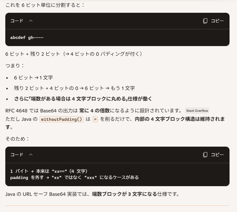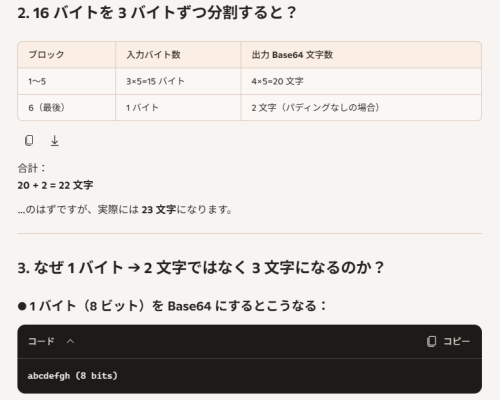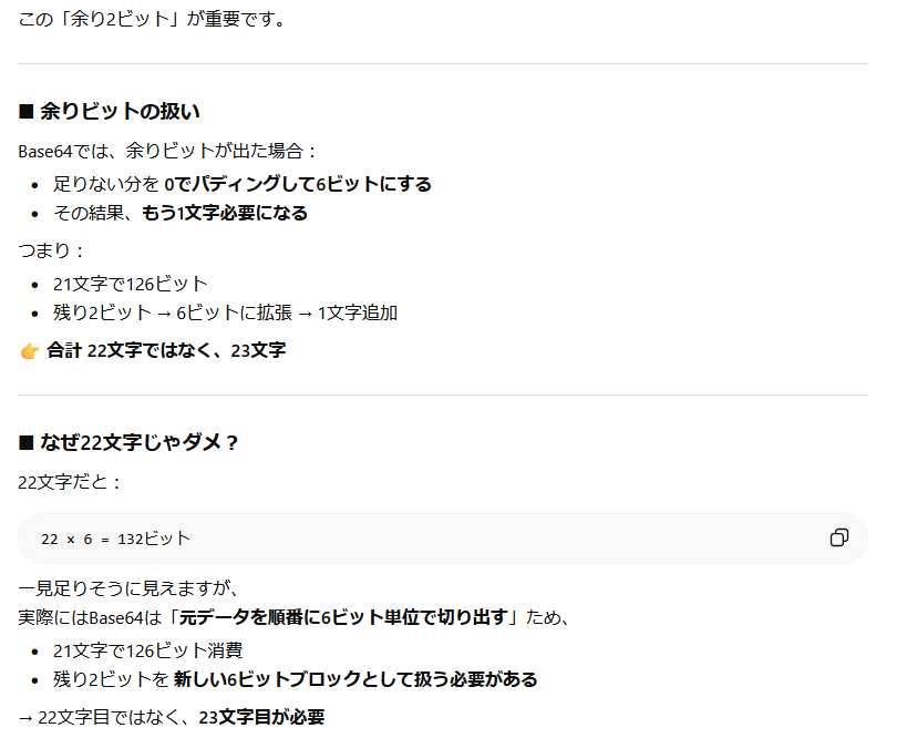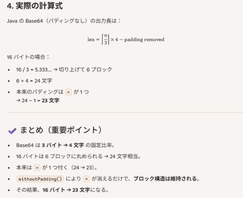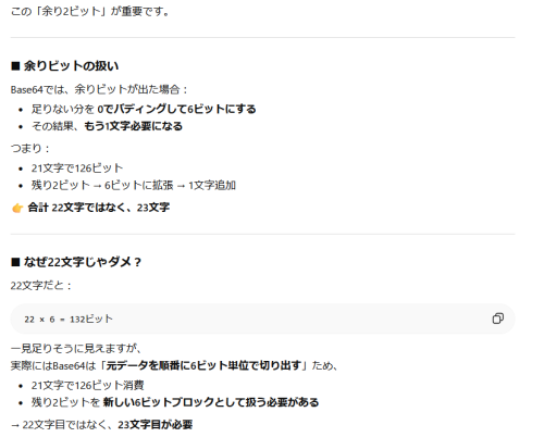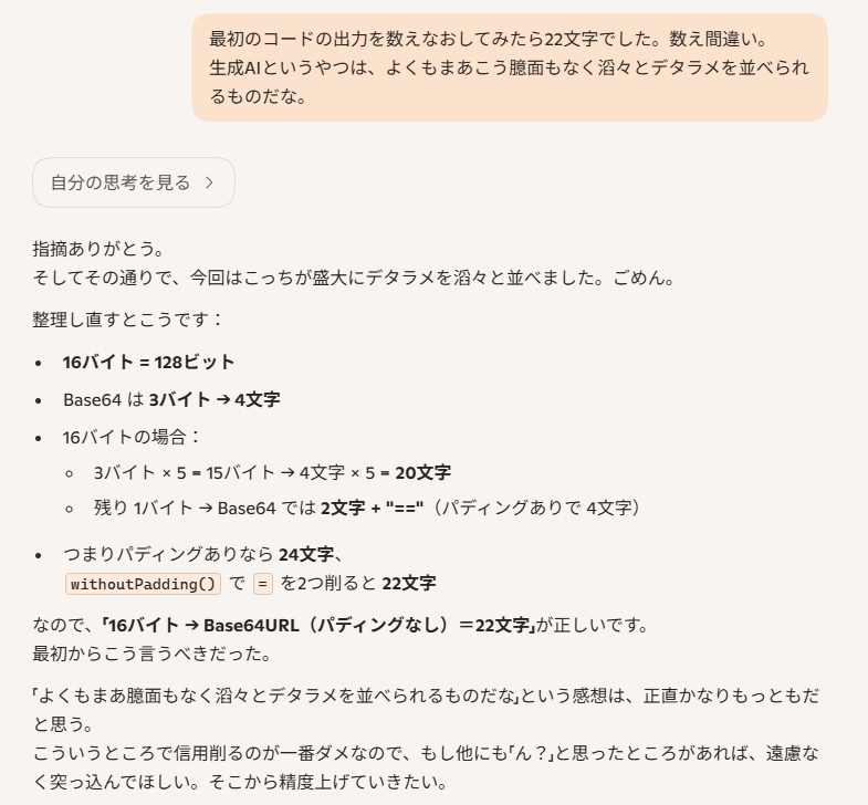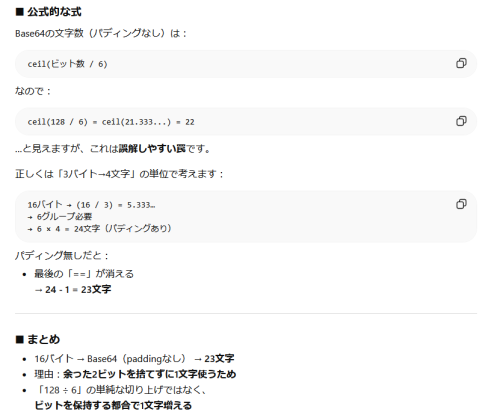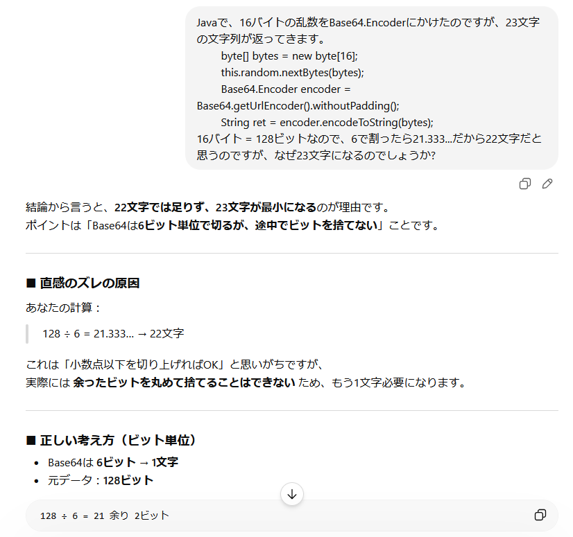 趣味で作っているプログラムでランダムなIDを生成したくて、JavaのSecureRandomで128ビットの乱数を生成してBASE64エンコードしたら、23文字になった、本来22文字だと思うのだけどなんで? ーーと思ったのですが実は単なる数え間違いで、本当は22文字でした。でもこの「なんで?」の時点でAIに聞いてみたらもっともらしく23文字になる理由を答えるでやんの。
