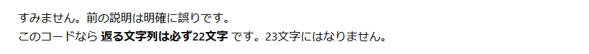 で、実際よく数えてみたら22文字だったわけで、まあ私が間抜けだったわけですが、生成AIというやつは結局LLM(大規模言語モデル)なので「こちらの話に合わせて応対する」ものなんですかねえ。でっかいマルコフ連鎖、というほど単純なものではないのだろうと思いますけど。