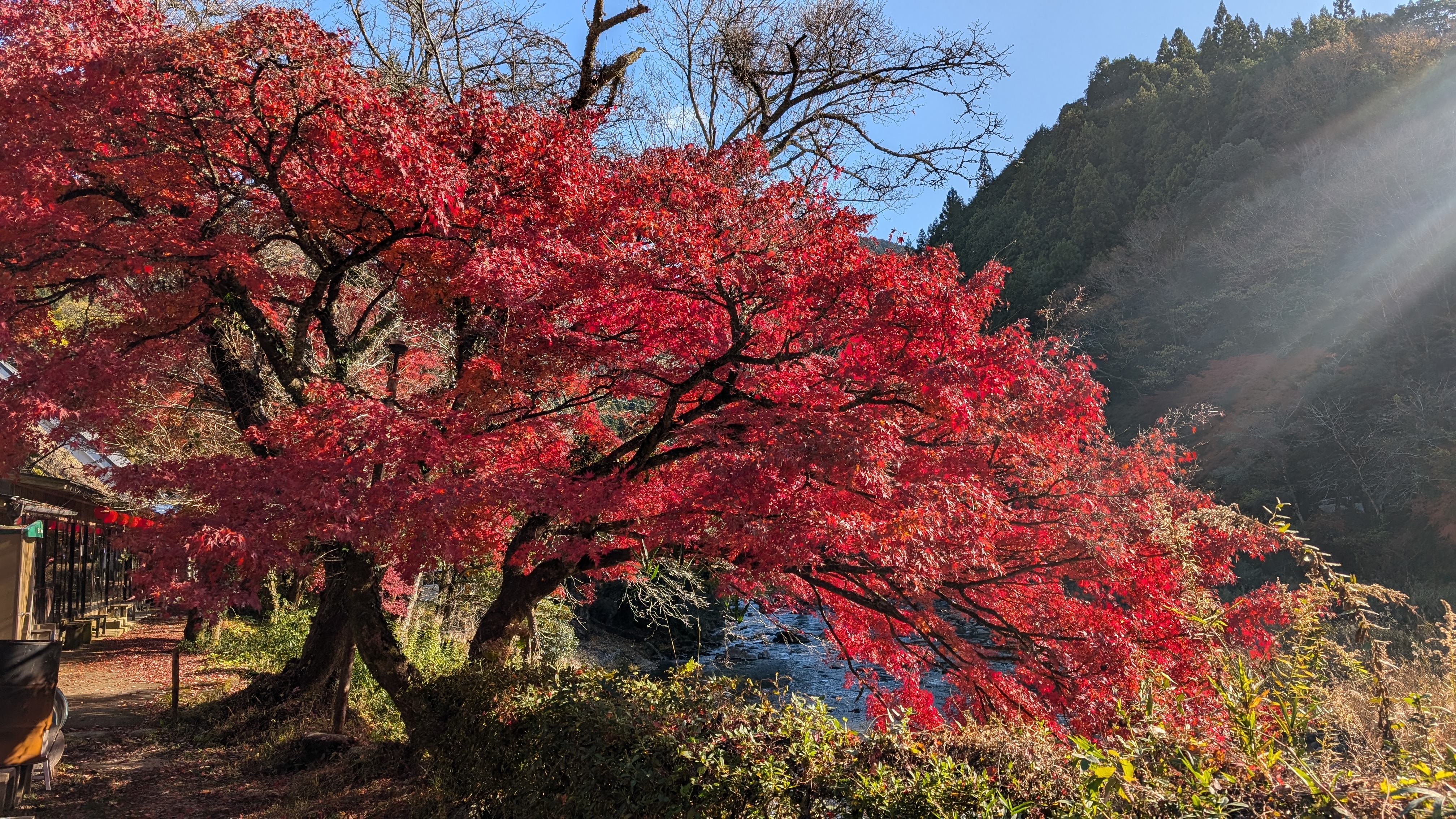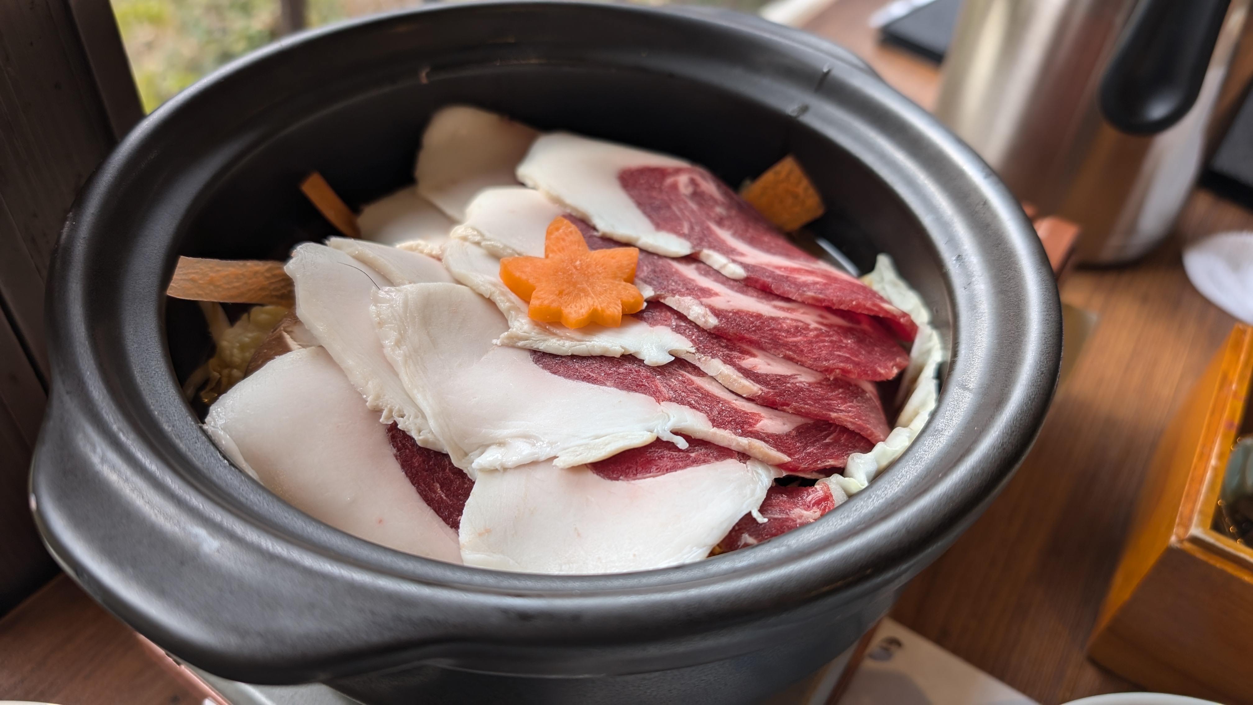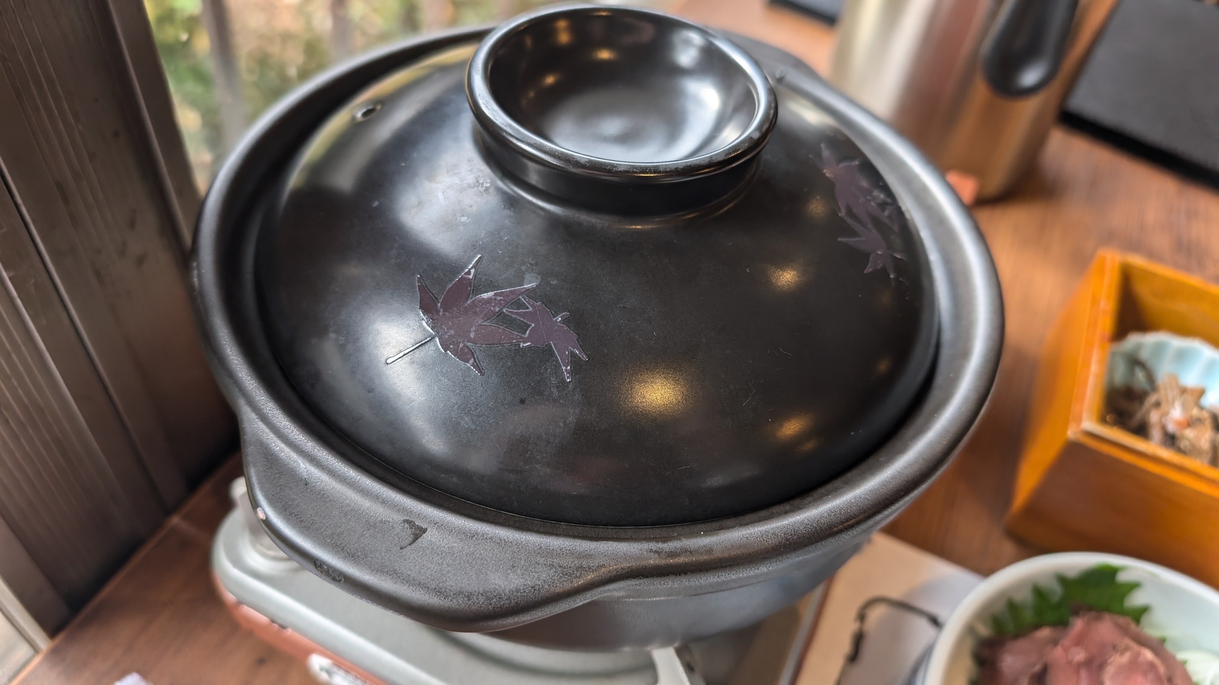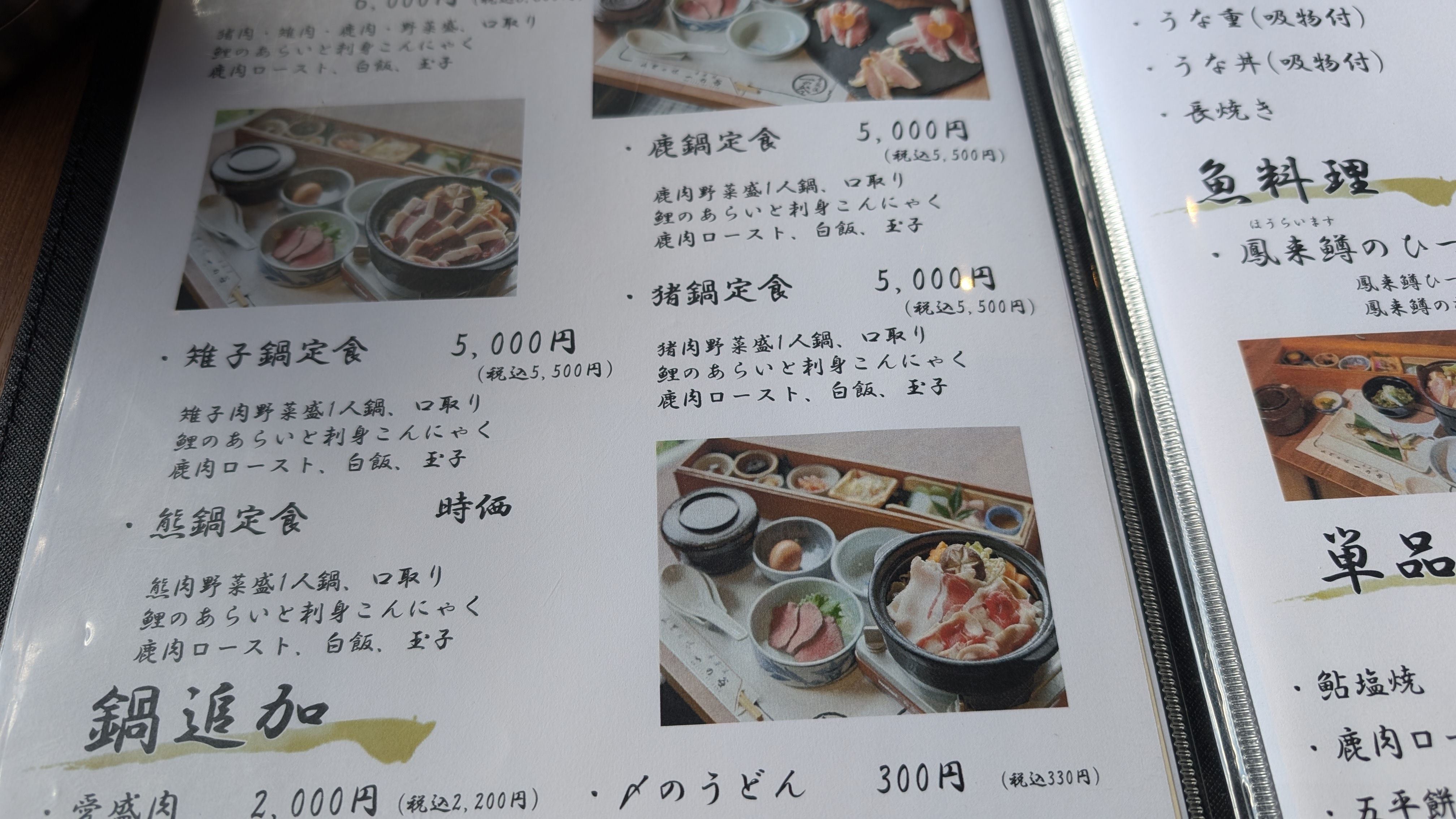 ここに「今日時点では紅葉はまだまだだったので、もう1回行くとして、12月初旬でもよいかも。」と書いたとおり、本日行って来ました。今回の目当ては一の谷の鍋です。鹿鍋にするか猪鍋にするか、と思っていたのですが、結局「時価」の熊鍋にしました。熊鍋は何年か前に一度食べたのですが、久々ですし、めったに食べられるもんじゃないですし、こうしてお金を使うことでハンターさんにちょっとは回るかもしれませんし。