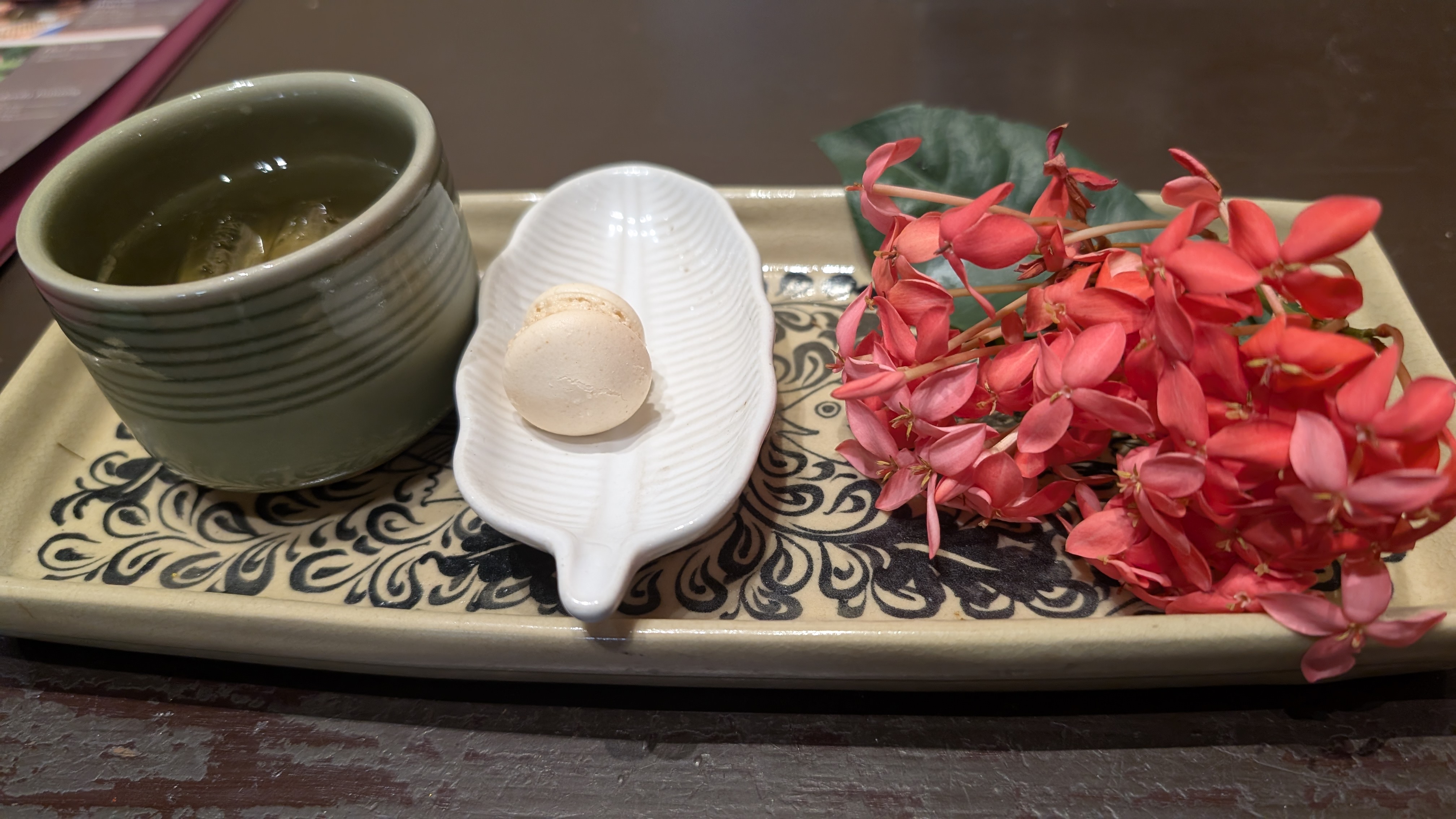 ホテルに着いたらチェックインのときお菓子とお茶を出してくれました。サービスいいんですが、このお茶がクソ甘いのが難点……