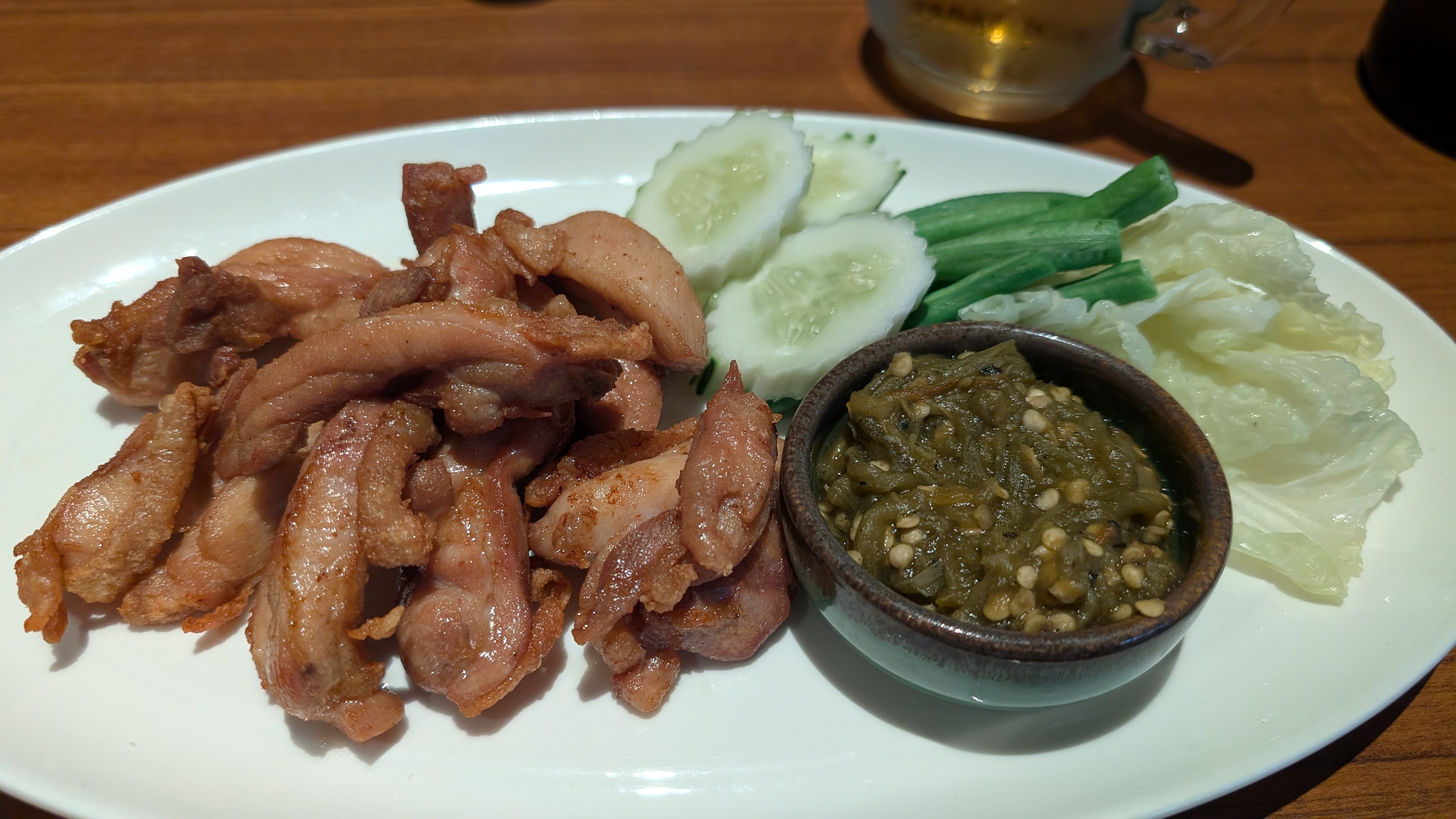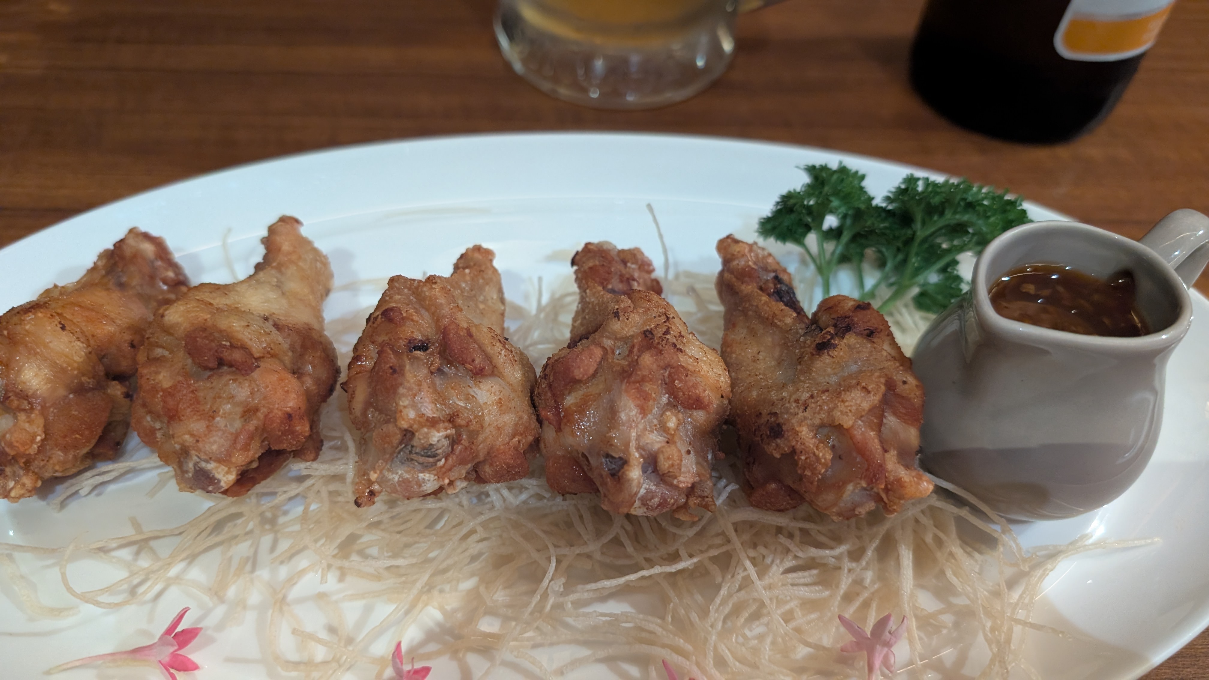 チェンマイ1日目夕食。ホテルのレストランにて。チキンウイングの揚げたのというから手羽先かと思ったら手羽元だった。