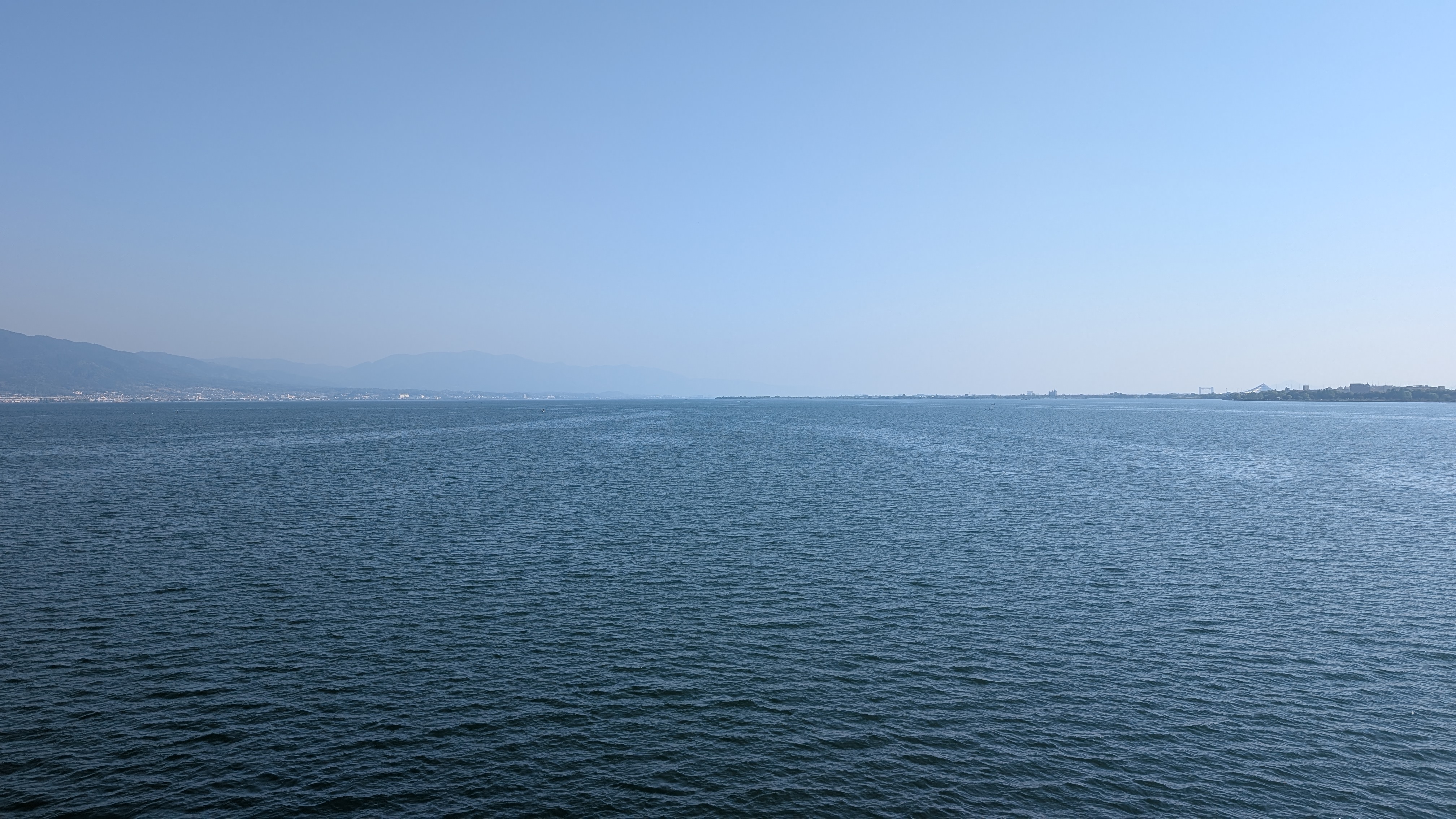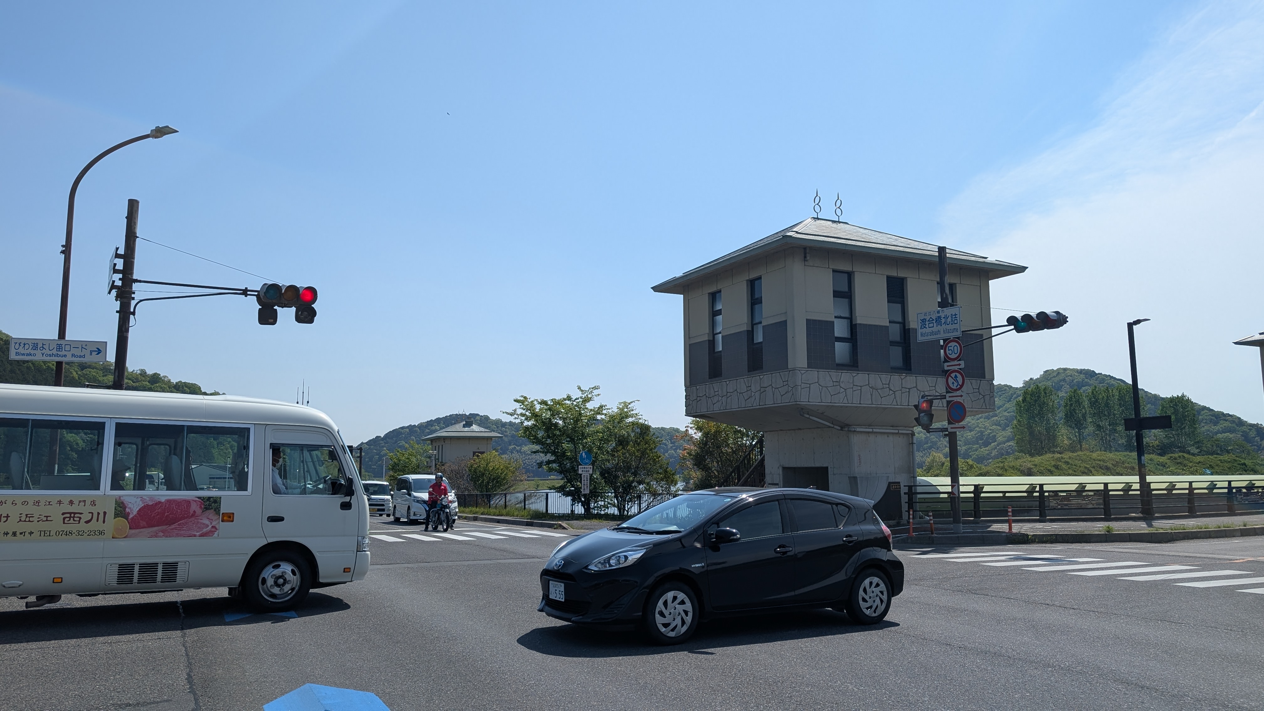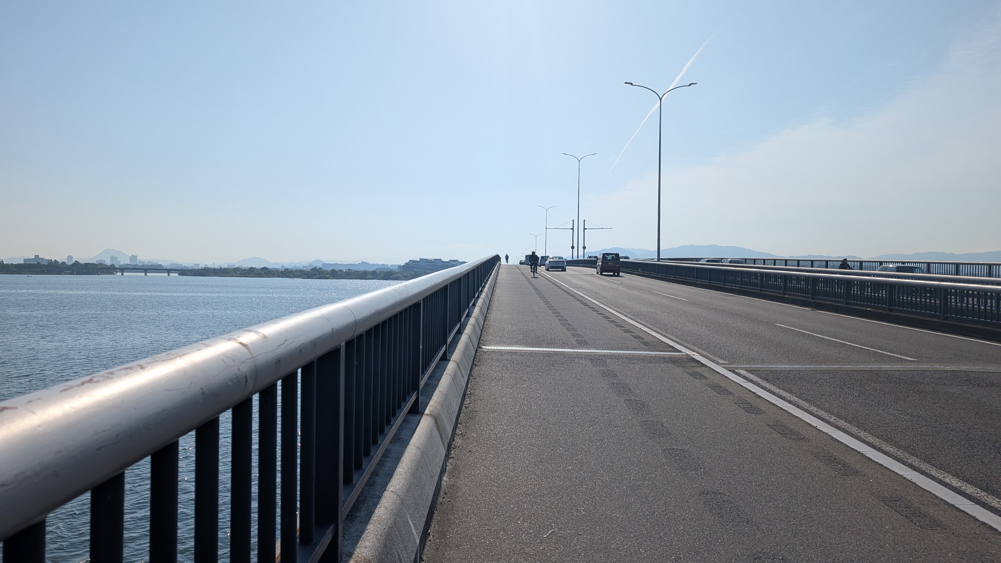 近江大橋です。ここまでは主に1号線で20kmくらい、坂はあるわ分岐があってうっかりしていると高速に乗らされそうになるわ高速から降りた車が左から合流してくるわで気が抜けない。なので毎回写真も少ないのです。