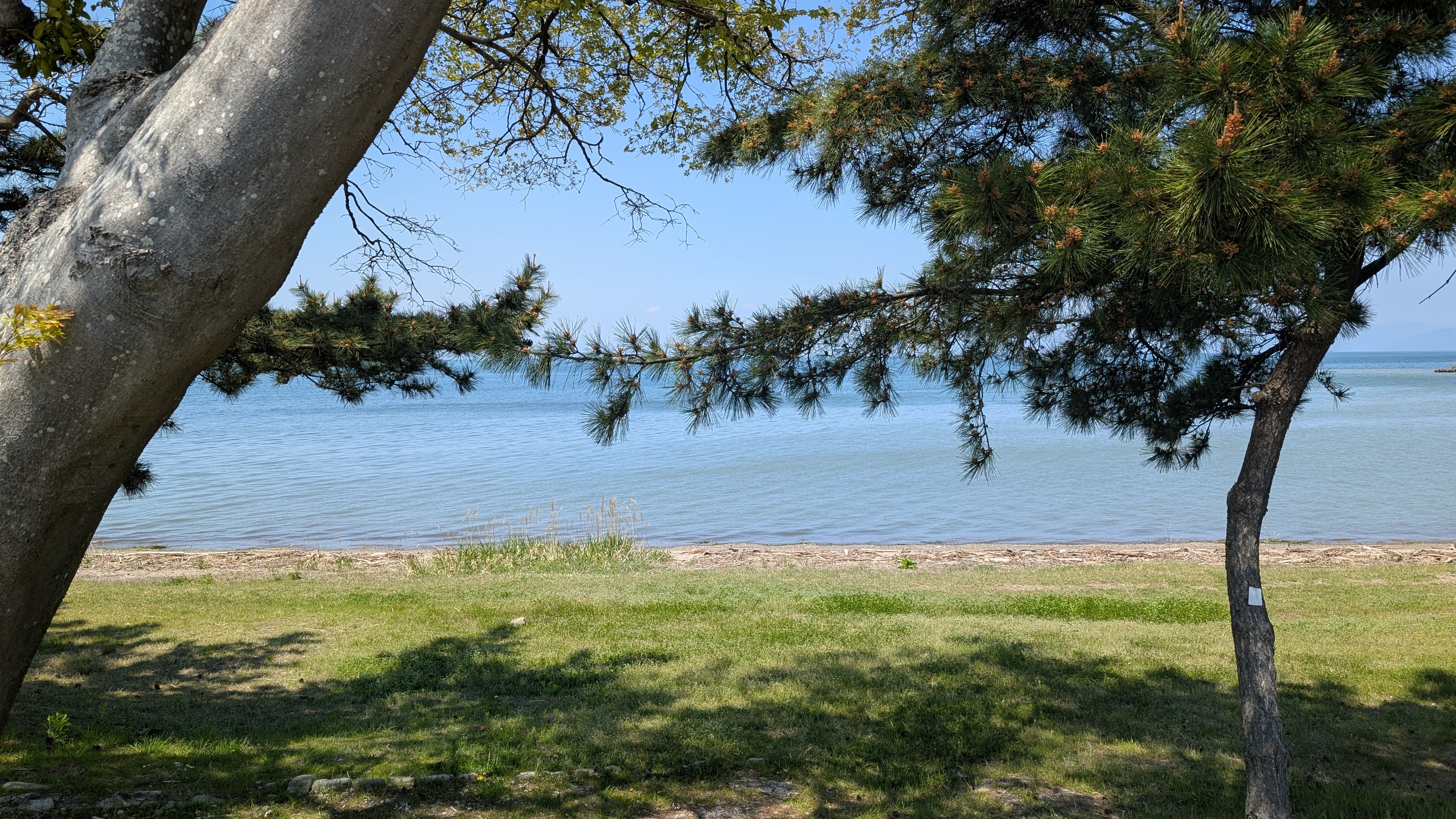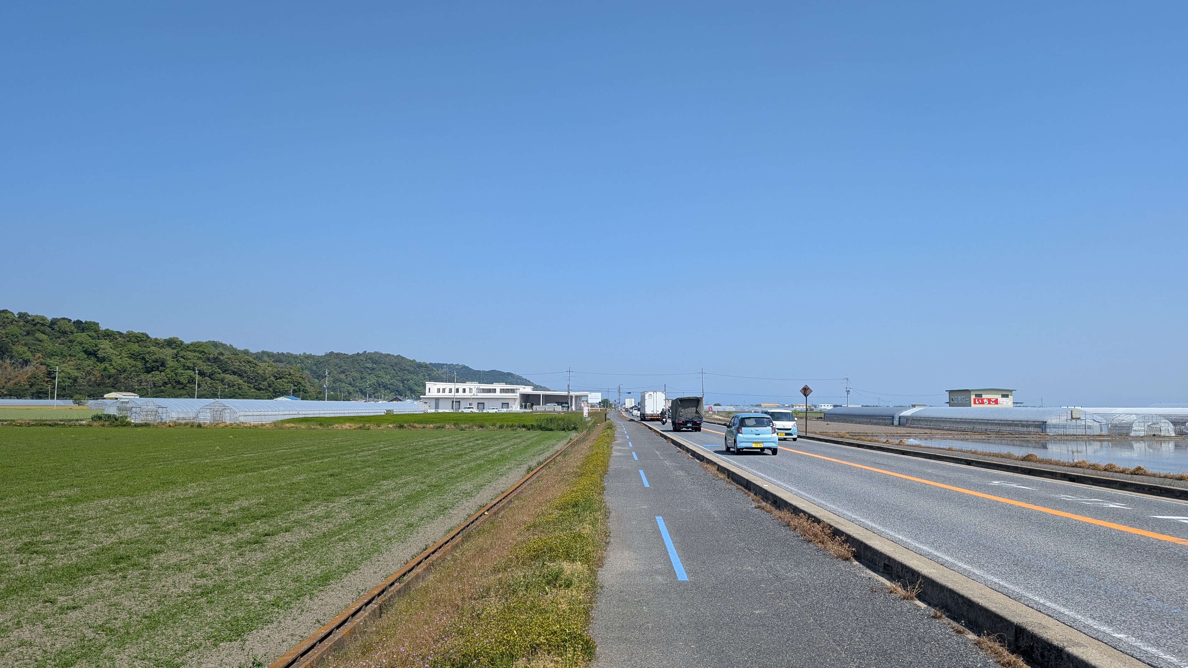 昼食食べたお店の裏側の湖岸道路です。いつもこの店に来るときは少し前に湖岸道路を離れて表側の道からくるのですが、以前ビワイチやったときにはここを通った、はずなのですが、普通に走ると表側の道に誘導されるのでどうやって来たのか覚えていない。