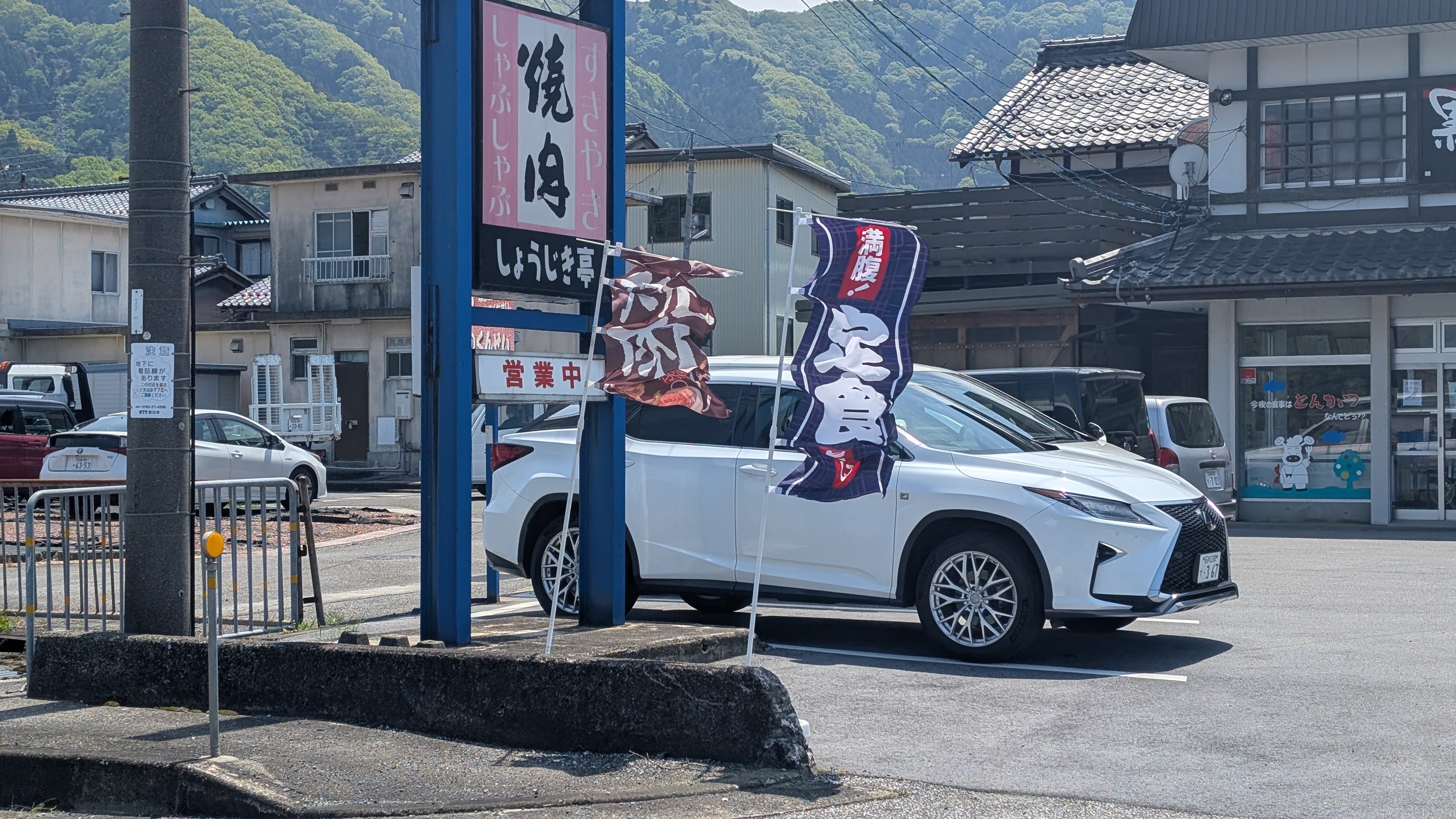 で、21号に乗ってみたら、暴風向かい風ですよ。「定食」ののぼりがはためいているのがわかりますでしょうか。