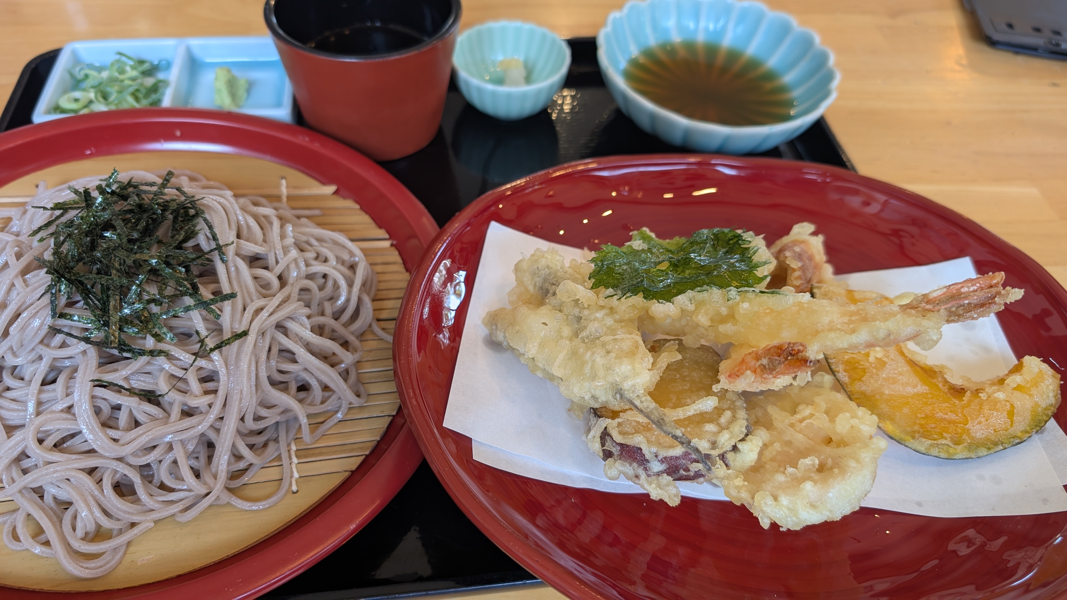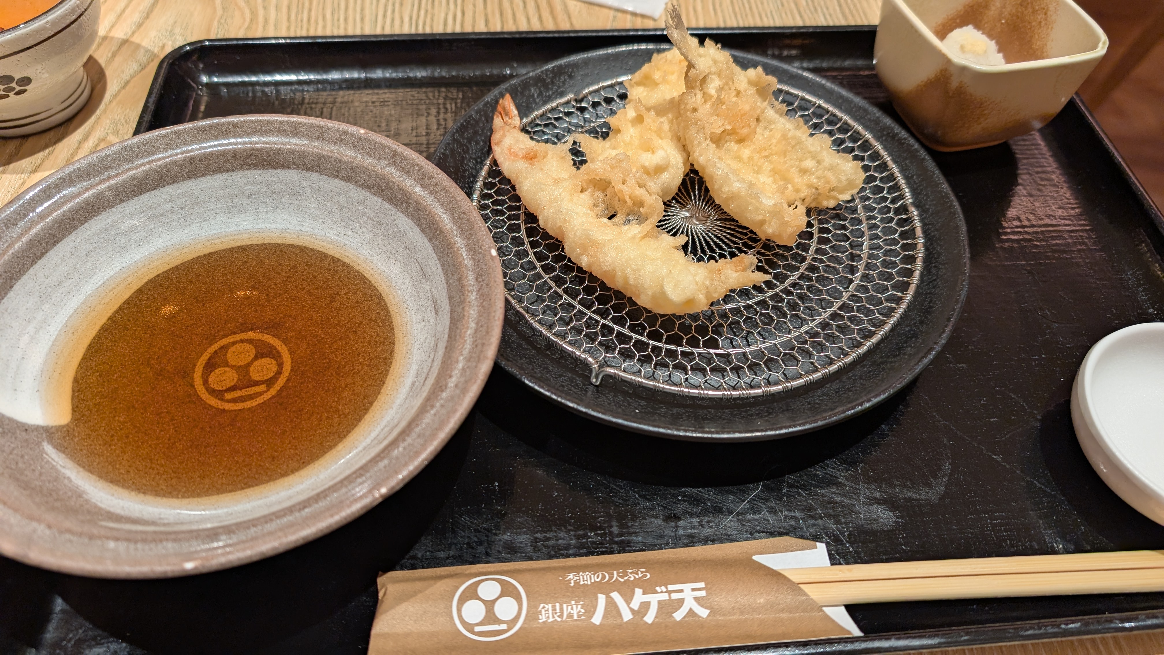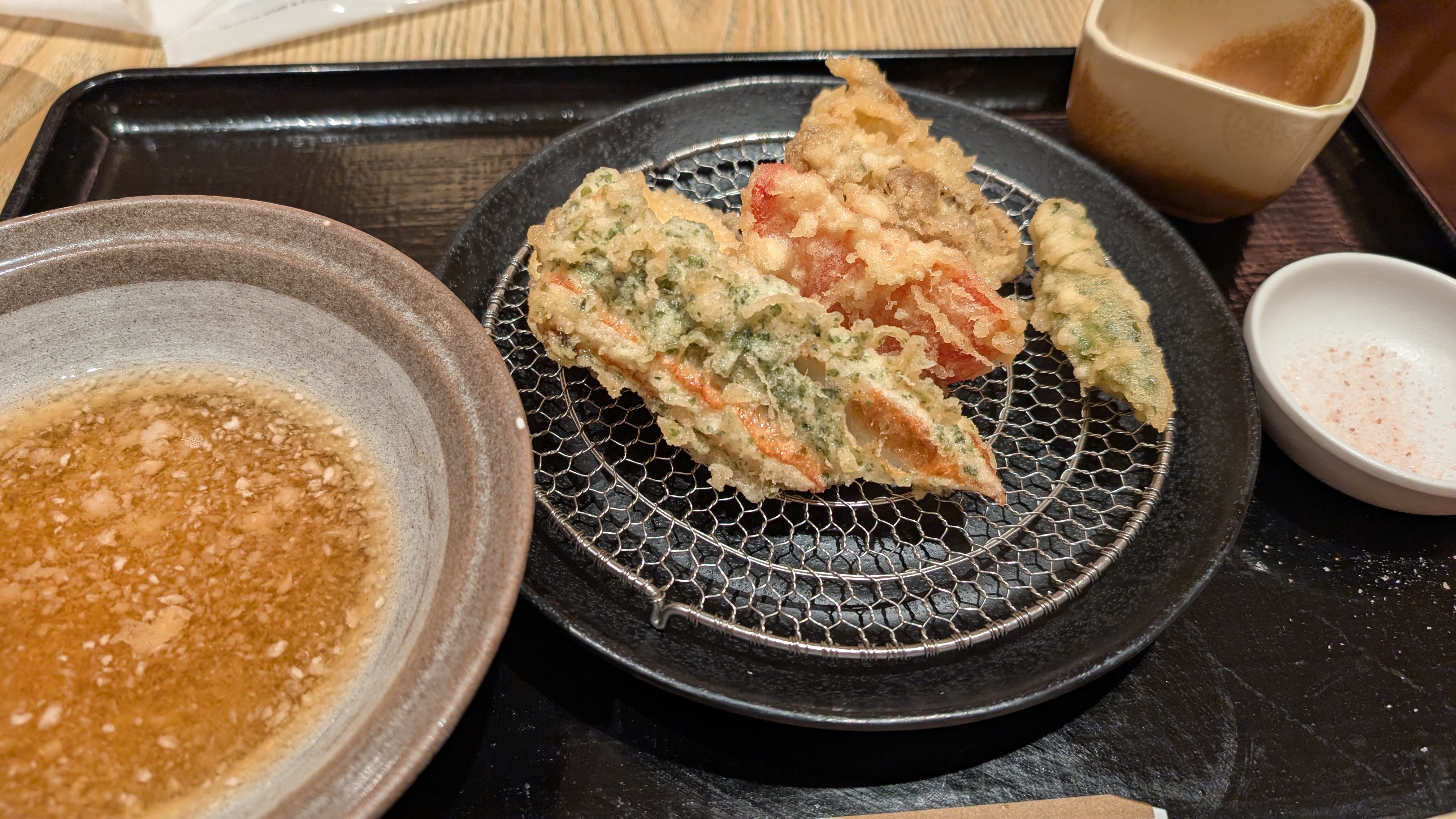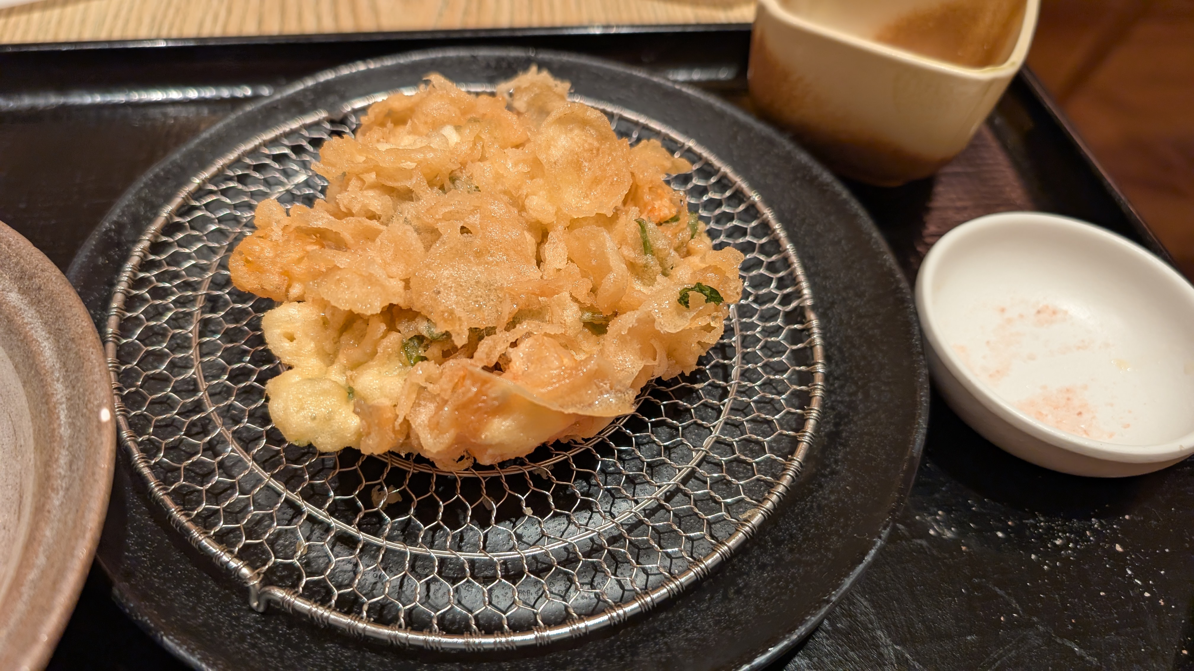 天ぷら盛り合わせの小。小とはいえ8品あるのですが、揚がった分から持ってきてくれるのでまず3品。ごま油の香りがすごい。