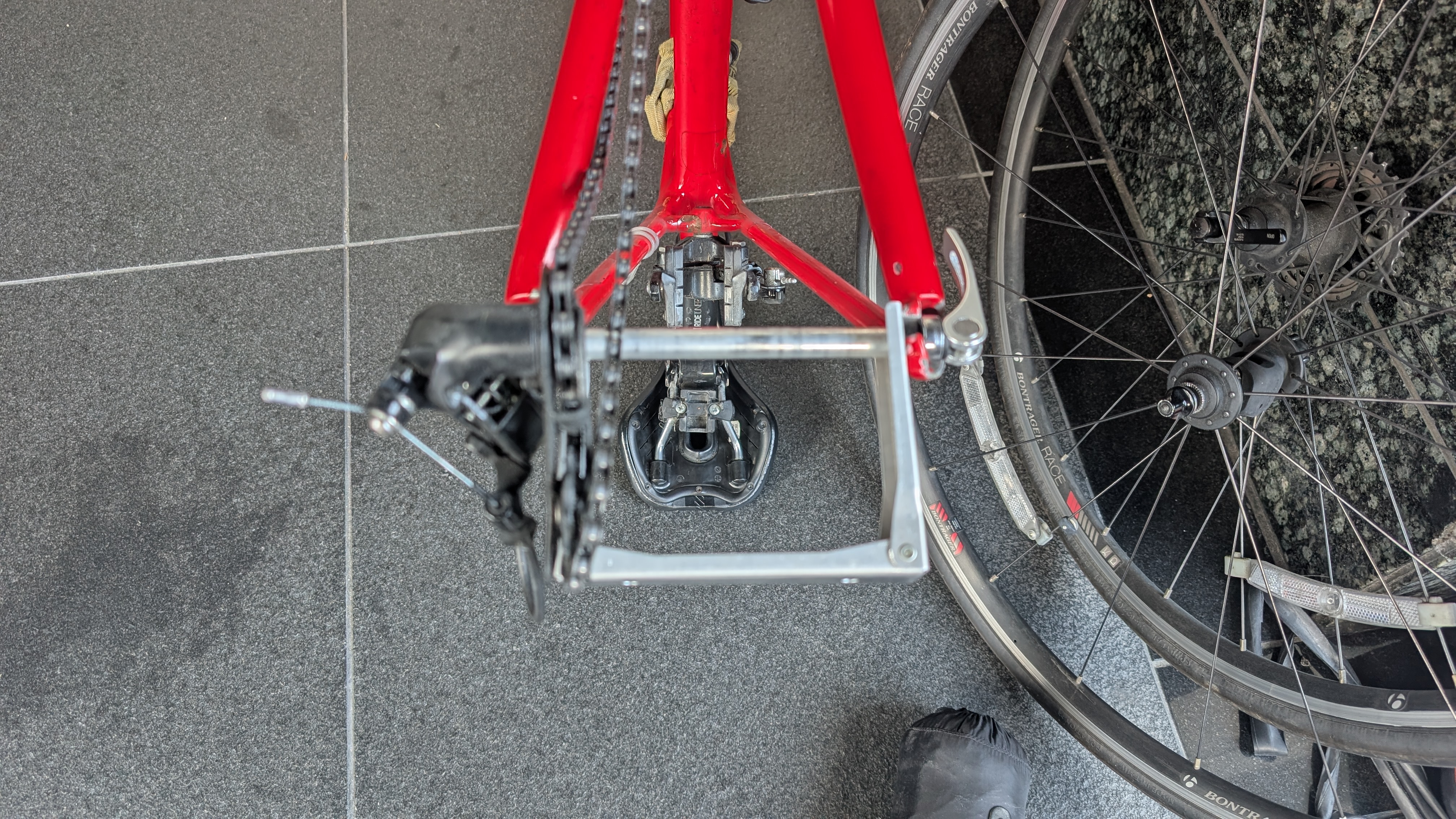 エンド金具を一応つけているのですが、横置きだと意味ないですかね。この長さだとリアディレイラーを覆いきっていなくて、内側から外側に向けて何かぶつかったら曲がりそうだし。