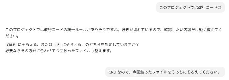 CodexはもともとLinuxとかで使う前提のツールのせいか(CLI版はWindowsではWSL2から使う必要があったはず)、修正した箇所だけ改行コードがLFになってしまいました。CR+LFに直してもらいます。