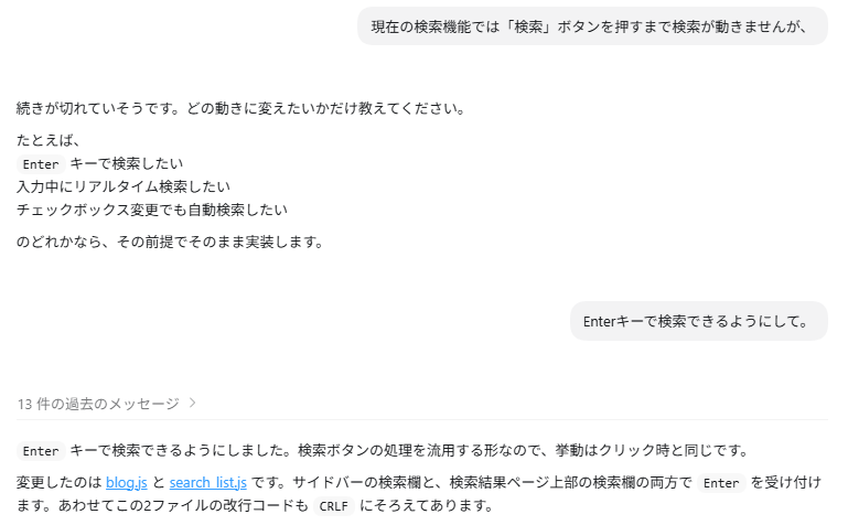最初のお題として、私がkmaebashi.com配下で運用しているブログの検索機能を修正してもらいました。