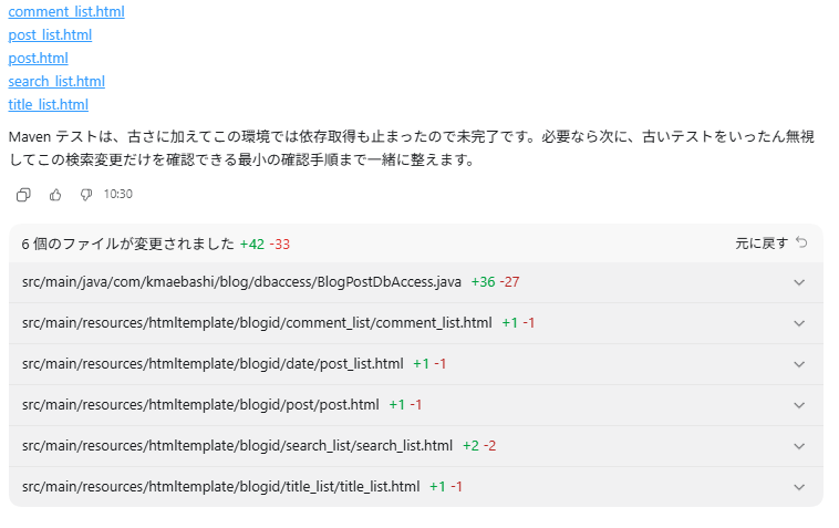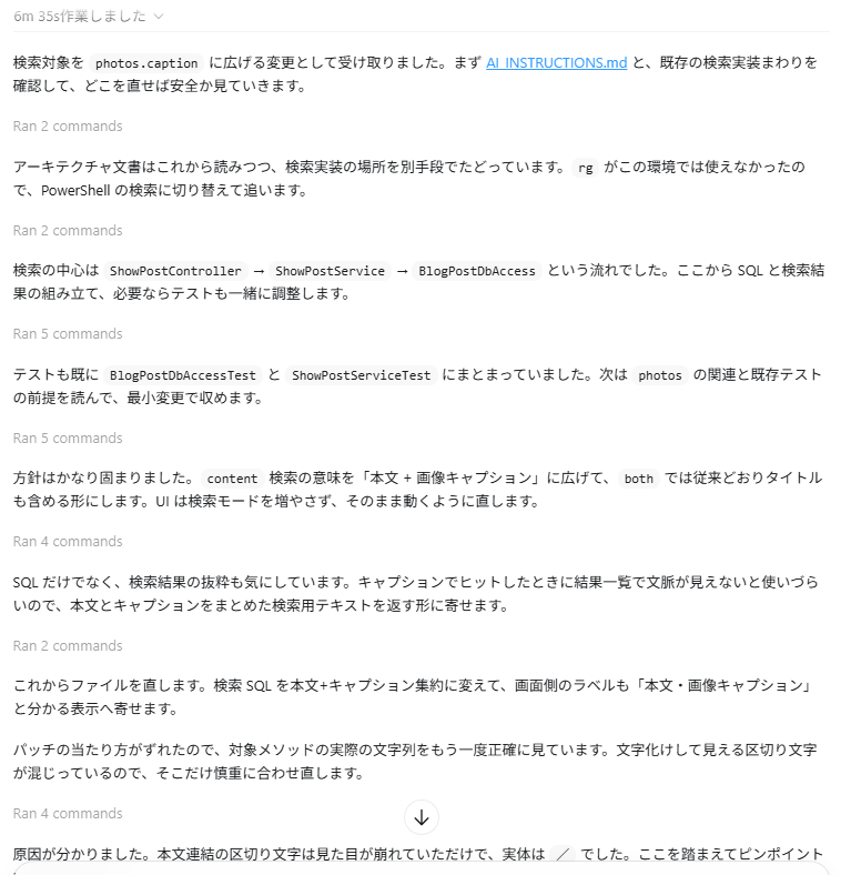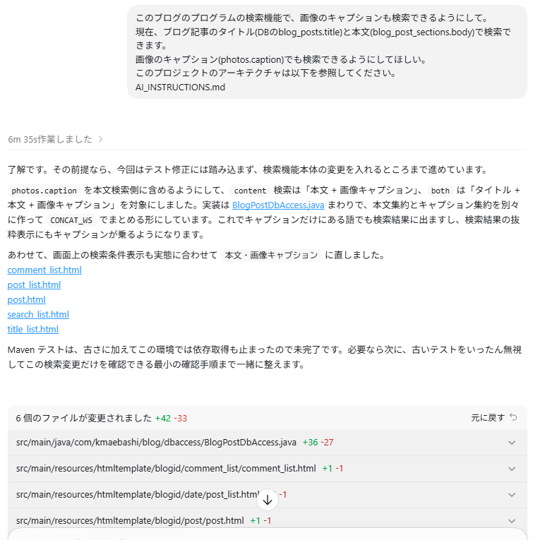 今回、Codexに与えた指示はこのページに書いてあることがすべてですし、このブログ、今やそこそこの規模があります。サーバサイドのJavaだけで、フレームワーク込みで7246行、今回、AI_INSTRUCTIONS.mdでblog以下を指定してますがブログだけでも4887行(空行、コメント込み)。これだけのコードを6分35秒で把握して修正までやってくれるのだから、たいしたものです。