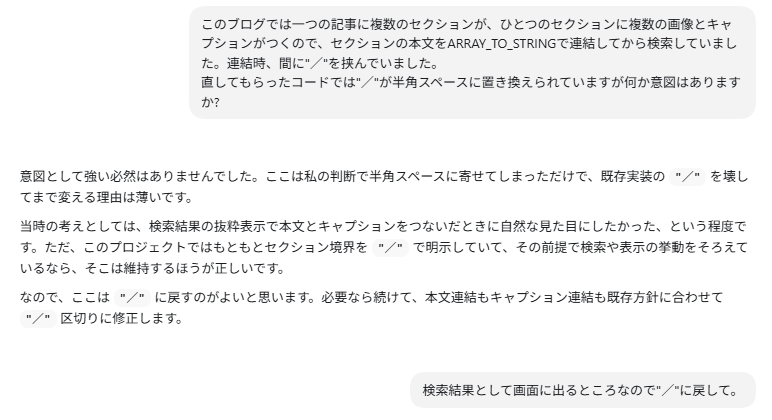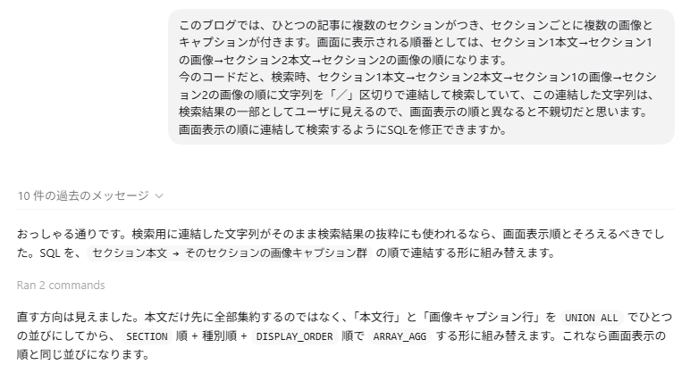 上で貼ったSQLは実は修正版で、最初の版では、ARRAY_TO_STRINGで連結するところは「/」ではなく半角スペースで連結するようにCodexに改変されていました。この「/」は「マッチした箇所前後の文章を表示する」ところでユーザに見えるので、「/」なのがセンスが良いかは置いておいて、勝手に変えられてしまっては困ります。